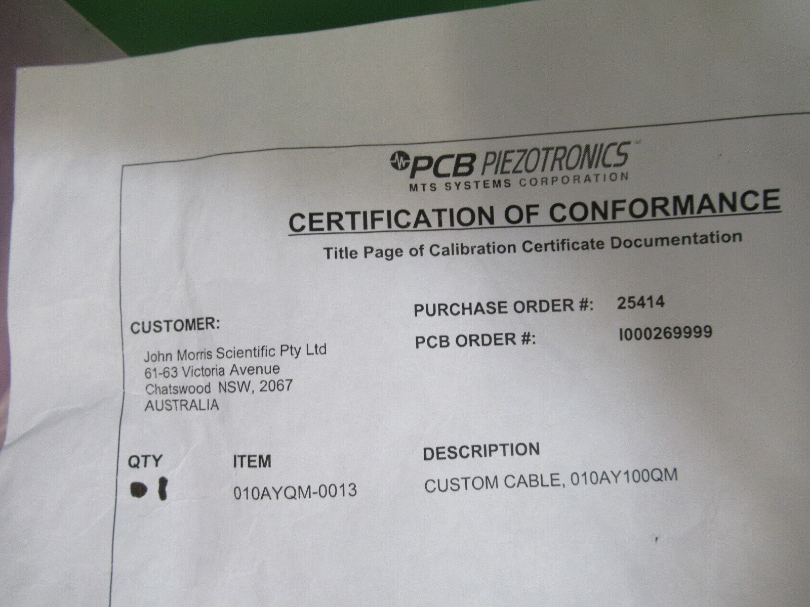 PCB PIEZOTRONICS CABLE 1/4-28 TO TWO BNC 100 FEET 010AYQM AS PICTURED 18-FT-54