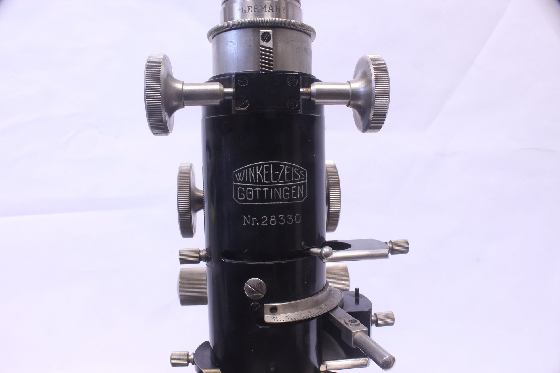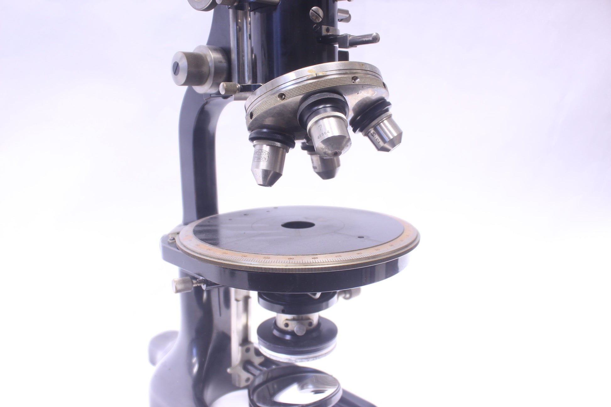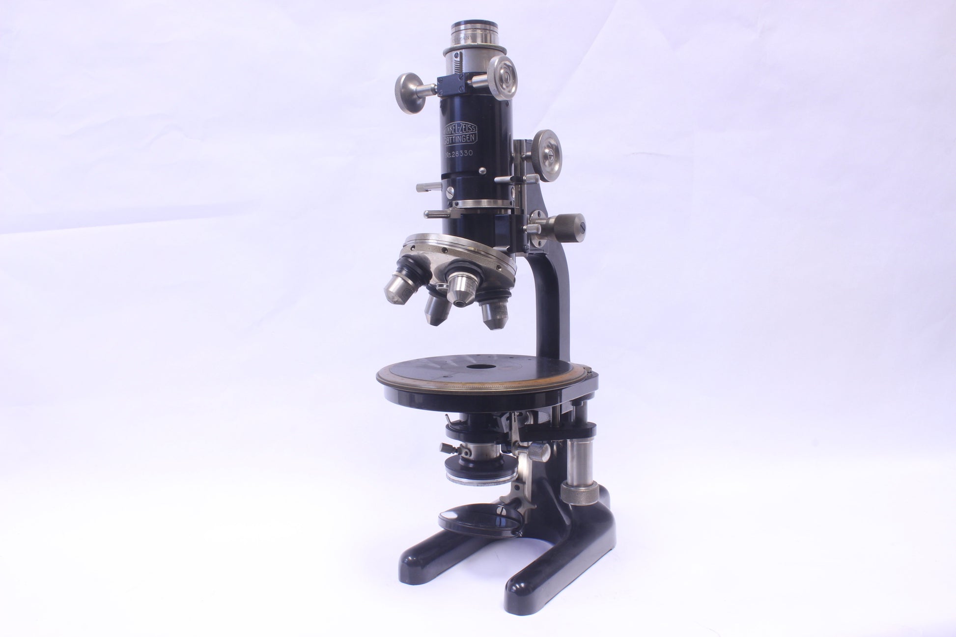 A rare antique polarizing microscope produced by Winkel-Zeiss approximately in the late 1920s-early 1930s per its serial number (No. 28330). Originally an independent microscope manufacturer, Winkel was acquired by Zeiss in 1911 and continued to operate relatively autonomously as Winkel-Zeiss until being fully incorporated in the 1950s.