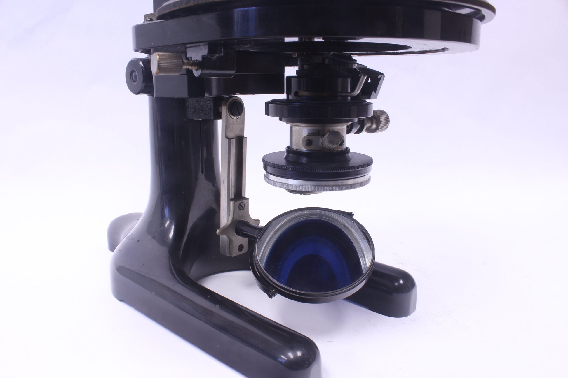This piece is a large instrument, measuring 15 inches (38 cm) tall and weighing close to 18 pounds (8 kg). It is in good condition all around, with light rusting on the stage edge, some minor scratches in its black enamel finish, and other general signs of wear. It includes four Winkel-Zeiss objectives as well as various filters and optical components for light polarization.