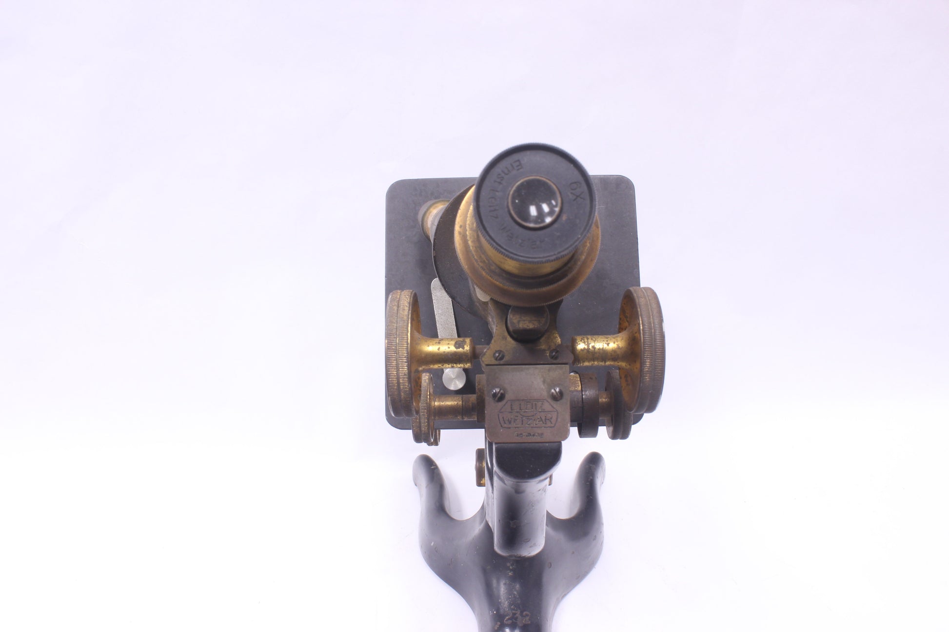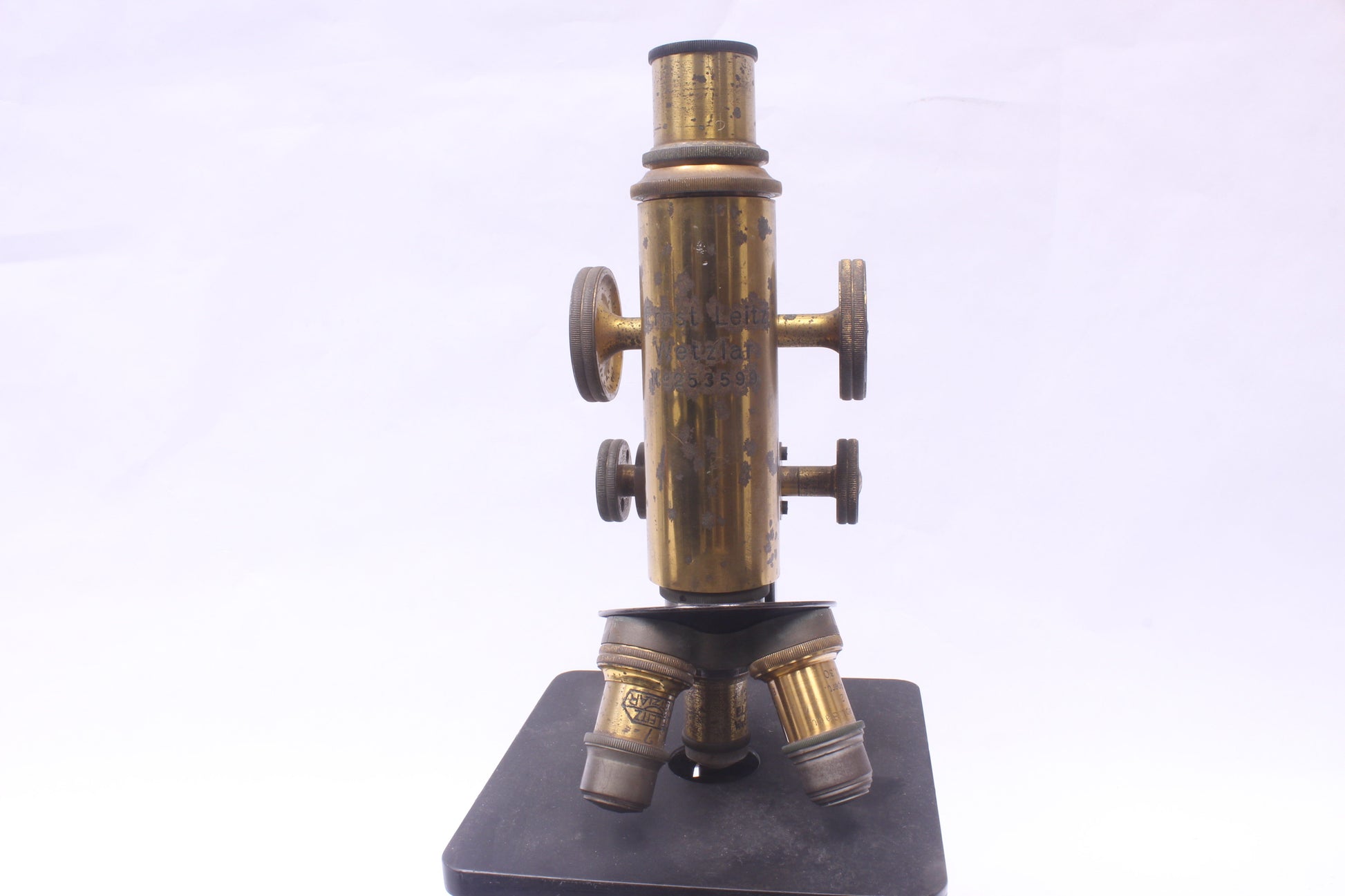 A decent quality antique brass microscope with some spotting on its brass exterior. The instrument was produced by Ernst Leitz Wetzlar some time around the mid-1920s, per its serial number (No. 253599).