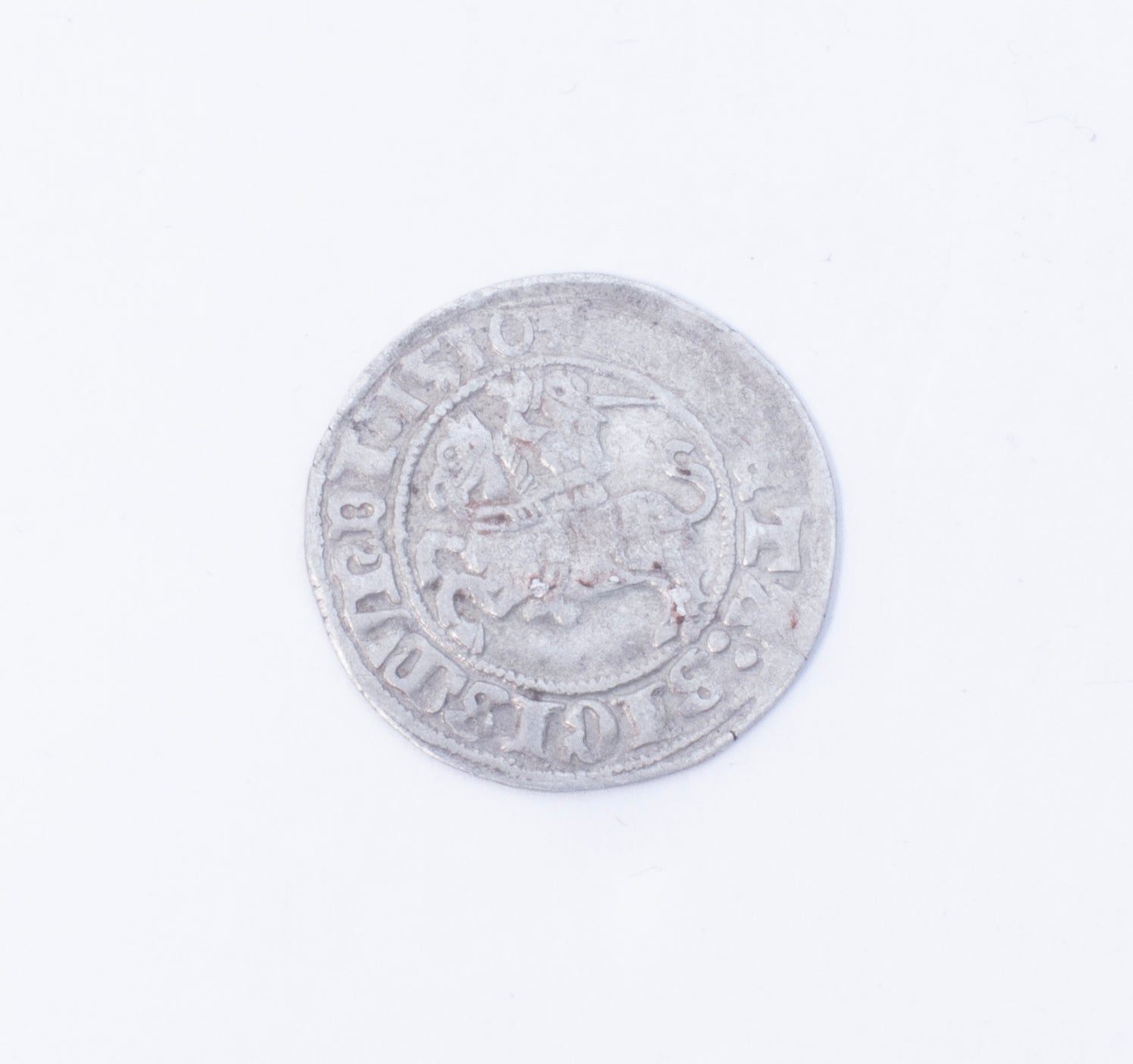 It is approximately 20 mm in diameter and a gram in weight. The obverse side features an armored horseman with the text "SIGISMUND I: 1510" and the reverse side features an eagle with the text "?LITVA?". On both sides, part of the text has been eroded, but otherwise, the coin is in quite good condition.